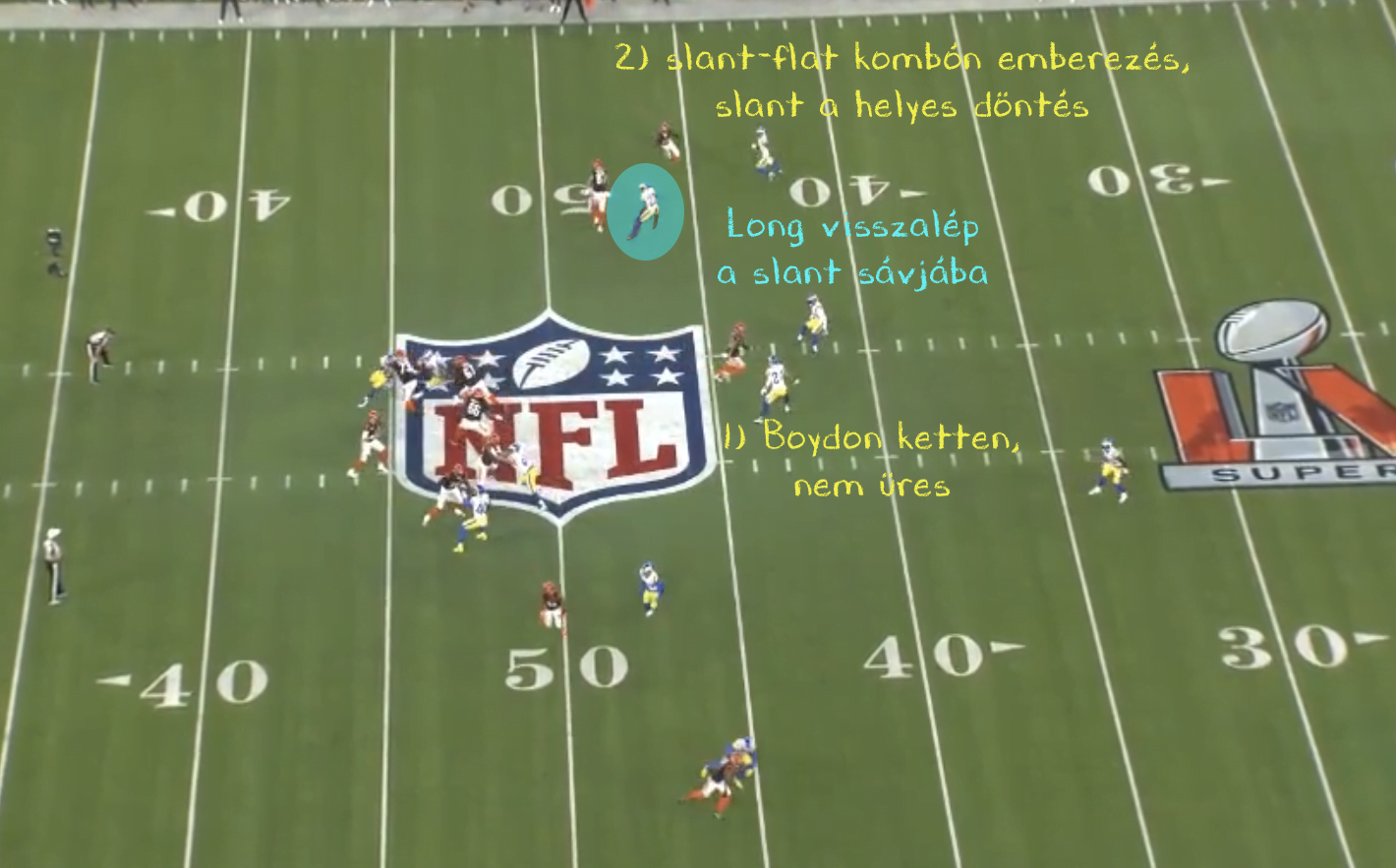 Az első olvasást tehát elvette a Rams, jöhetett a másik. Mivel emberezés volt, így a helyes döntés a slant megdobása volt Burrow-tól elméletben. Igen ám, de Long egy kicsit hátralépett, belépett a passzsávba. Mindezt anélkül, hogy a QB-ra nézett volna, tehát csak az elkapók mozgásából tudta, hogy slant-flat kombináció van és ebben az esetben a slant lesz a QB olvasása.