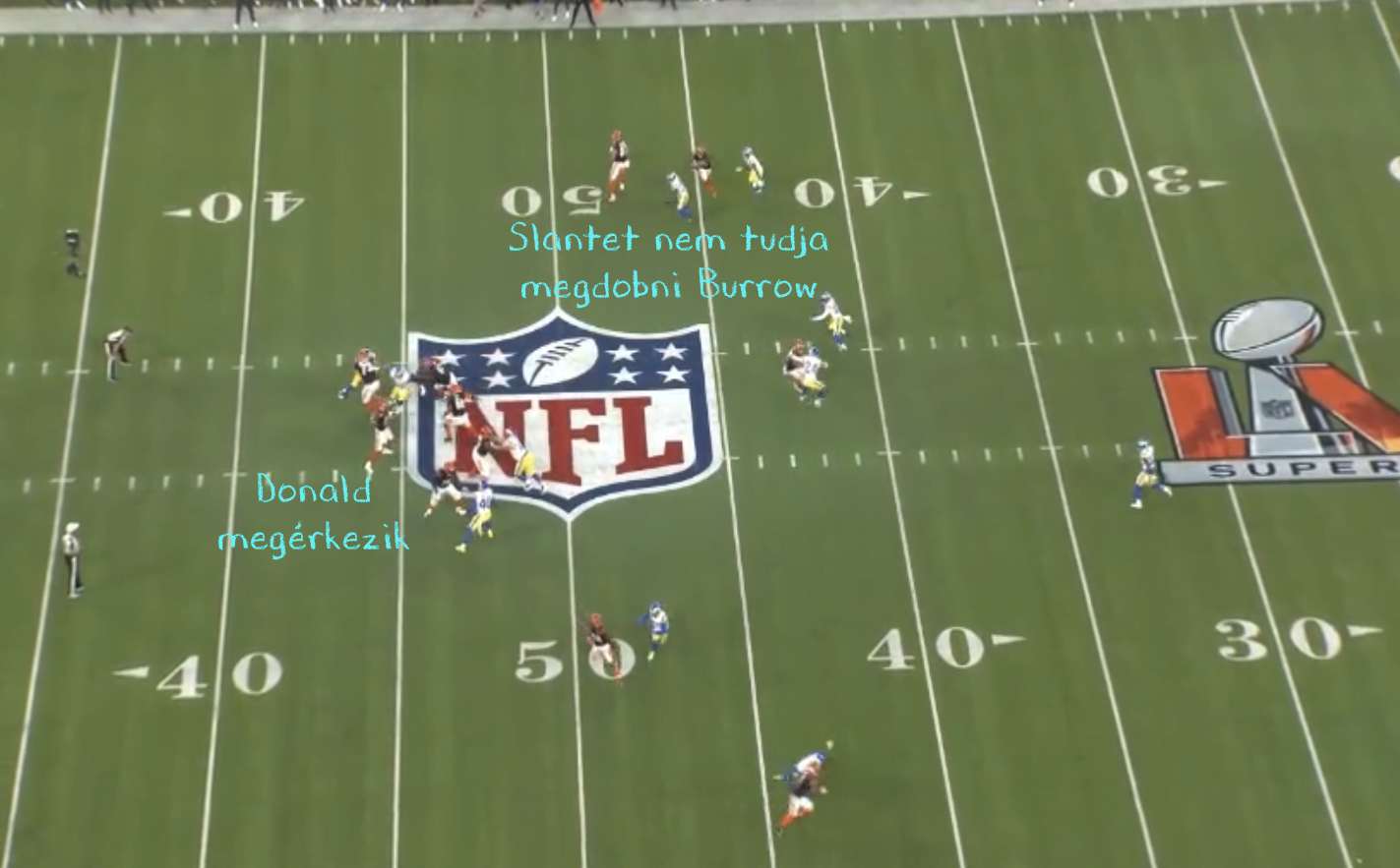 Mindeközben pedig Aaron Donald gyorsan megverte Spaint és megérkezett Burrow-ra, aminek hivatalosan nem lett sack a vége, de gyakorlatilag igen és ezzel a Rams megnyerte a Super Bowlt.