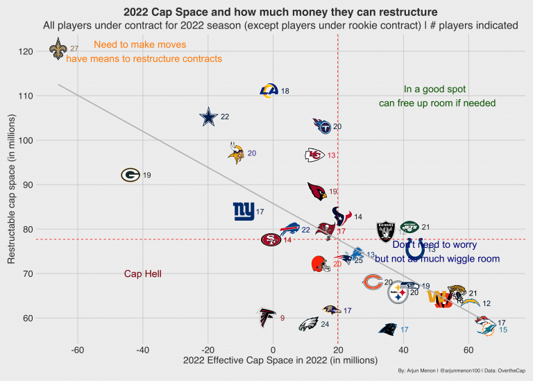 Azonban ennél mehetünk egy lépcsőfokkal mélyebbre is, hiszen önmagában a cap space még nem mutat meg mindent. Ahogy a tavalyi Saints, Falcons vagy Eagles példáján is láttuk, nem olyan nehéz cap space-t kreálni szerződések átalakításával. Könnyű lenne azt mondani, hogy a Saints hatalmas bajban van a mínusz közel 80 milliós helyzetével, de ha közelebbről megnézzük a szerződéseiket, akkor láthatjuk, hogy akár 120 milliós is felszabadíthatnak (ennyit azért nem fognak, de bőven van mozgásterük).