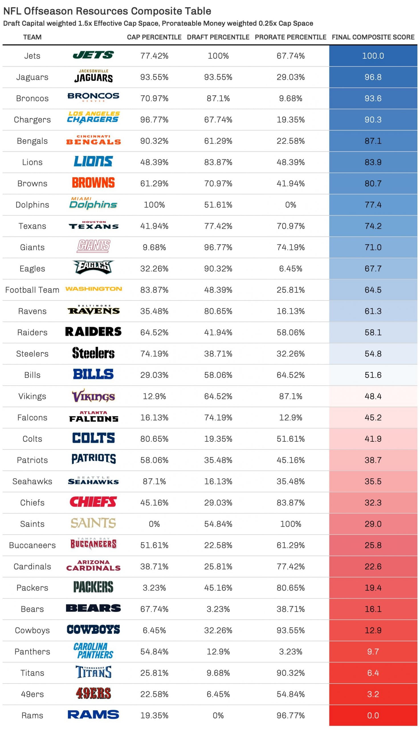 A cap space-ből (0,4x súlyozás), az átalakítható cap space-ből (0,1x) és a drafttőkéből (0,6x) pedig kihozott a PFF egy összetett mutatót, amiből pedig az alábbi lista jött ki a legtöbb holtszezonbeli erőforrástól haladva a legkevesebbig.