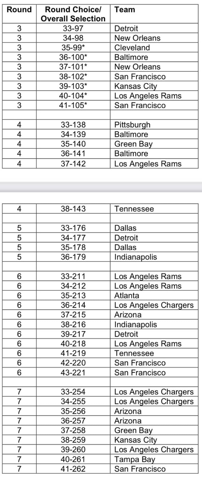 A Lionst Kenny Golladay elvesztése miatt kompenzálta a liga a legmagasabb kompenzáció pickkel, míg a Saints kapta a második legmagasabbat Trey Hendrickson eligazolása miatt. Ezzel véget is ért a játékosok után járó harmadik körös kompenzációs pickek sora: a Browns, a Ravens, a Saints, a 49ers és a Rams pickjei azért jártak, mert kineveltek egy kisebbségi főedzőt/general managert.