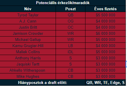A védelemben a fent említett pár szabadügynököt visszaigazolnám és melléjük kellene találni pár hasznos játékost. A taktika lehet megint az, hogy több potenciális kisebb nevet hoznak, hátha megint beválik egy-kettő, mint tavaly. Cornerbacknek mondjuk Ahkello Witherspoon vagy Mike Hughes nem is lenne drága és egy prove it szerződés náluk is szóba jöhet, safetynek pedig Anthony Harris vagy Jaquiski Tartt mutathatná meg hogy több van benne, mint gondoljuk. Ők mind olyan játékosok, akiket aránylag olcsón meg lehet szerezni, ellenben nem is kötnék hosszú időre magukat a csapathoz, mert majd egy jövőbeli nagyobb deal reményben érkeznének.