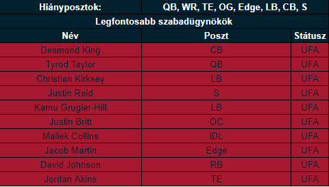 A Texans igencsak furcsa szabadügynökpiacot mutatott be tavaly, rengeteg közepes játékost igazolt, de mindenkit 1-2 éves szerződéssel. Nyilvánvalóan már arra az időszakra készülnek, ami Watson után lesz, hogy amikor megérkezik a jövőbeli franchise irányító, akkor minden lehetséges cap space és draft tőke rendelkezésre álljon majd.