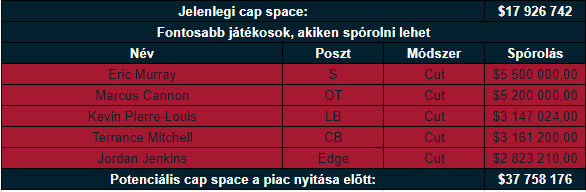 Közel 18 millió elkölthető pénzzel vág neki a piacnak a Houston, ami nem elképesztően sok, de igazából alig van nem feláldozható ember a rosteren, így ebből jóformán annyit csinálnak, amennyit akarnak. Ellenben ahogy mondtam azért célszerű néhány fontosabb láncszemet megtartani. Akit én mindenképpen kivágnék az Eric Murray, akinek az elküldésével 5,5 millió dollár szabadul fel. Ilyen képességű játékost valószínűleg még olcsóbban is találnak a piacon. Szintén kérdés nélküli Kevin Pierre-Louis, Jordan Jenkins és Terrance Mitchell például, hármukkal együtt 9 millió dollárt lehet felszabadítani és a rosszabbul teljesítő emberek közé is tartoztak.