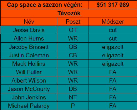 Ami még érdekesség, hogy szélnek lett eresztve szinte a komplett wide receiver és running back állomány, nem véletlenül. Sok veterán futó érkezett a szezon előtt és közben, de igazándiból egyikük sem tudta felülmúlni Myles Gaskint, ami azért nem a legmagasabb léc a ligában. Szintén nem hullajtanak könnyeket az elkapókért sem, viszont ezzel lehetett arra következtetni, hogy hova invesztálhat majd új szerzeményeket a csapat.