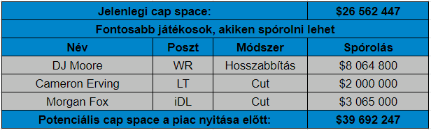 A táblázatból is látszik, hogy túl sok mindent nem tud csinálni a csapat. DJ Moore a liga egyik top elkapójává nőtte ki magát és a Panthers roster egyik legjobb játékosa. Idén már az ötödik éves opciójával játszik, egy hosszabbítás nagyon adja magát, pláne úgy, hogy ezzel 8 millió dollárt fel lehetne szabadítani. És itt vége is a történetnek.