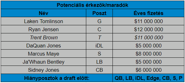 Mivel nem megy el 25-35 millió dollár QB-ra, így lehet a többi posztot erősíteni. A labda mindkét oldalán elférne az erősítés, de nagy pénzt mindenképp az offense-re kell költeni. Brady Christensentől függetlenül kell egy top guard és egy top center, ők pedig most Laken Tomlinson és Ryan Jensen. Az esetükben óriási előny, hogy rendszerfüggetlen játékosok és a játék minden elemében hasznosak. Az már nem egyértelmű, hogy a csapat rárepül-e egy jobb LT-re, a Combine alatt elég pozitívan nyilatkoztak Christensenről, de ha mégis jön valaki, akkor Trent Brownt, Duane Brownt vagy Eric Fishert tudnám reális opciónak elképzelni (még ha előbbi inkább RT). Mindhárman nagyjából ugyanazt a szintet és árkategóriát képezik és hatalmas előrelépést jelentenének. Egy Brown-Tomlinson-Jensen-Christensen-Moton ötös elég ütősen nézne ki, szinte már álomkategória, de kell a fal.