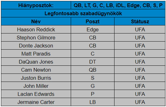 Cam Newton már nem több, mint egy low end csereirányító és nem valószínű, hogy kapkodnának érte a csapatok. John Miller 656 snapen volt a pályán tavaly és a 70. legjobb volt a posztján a PFF értékelése szerint, de hasonló értékelést kapott Juston Burris (77/92) és Jermaine Carter (73/87) is, Laclan Edwards pedig a liga egyik legrosszabb puntere volt.