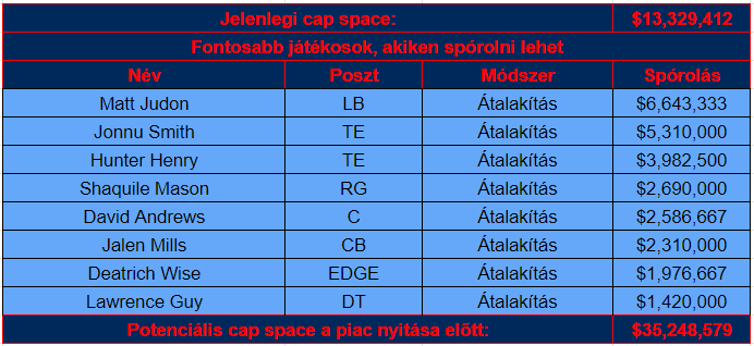 Ahol igazi mozgástere van a Patriotsnak, az a szerződések átalakítása. A 2021-es nagy igazolások közül Matthew Judon, Jonnu Smith, Hunter Henry és Jalen Mills szerződéséből is komoly összegek vihetőek át későbbi évekre.