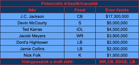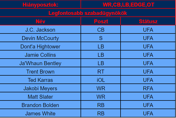 Nehéz helyzetben van a Patriots, egy hatalmas Bills elleni wild card kiütésből kellene lábra állni – és elhitetni, hogy az AFC Kelet nem Josh Allenék felségterülete –, azonban ehhez viszonylag szűkös erőforrásai vannak a New Englandnek. Mindezt úgy, hogy a Raiders lerabolta a fél front office-t és a teljes támadóoldali személyzetet. Szabadügynök pedig van bőven.