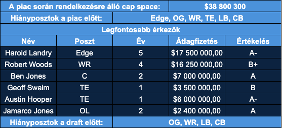 Mellette érkezett egy másik célpont is, a Brownstól meglepetésre kivágott tight end, Austin Hooper. A két elkapó mögé/mellé mindenképpen hiányzott már egy TE ebből a csapatból, mert az eddigi felhozatal elkapásokban soha nem jeleskedett. Viszonylag jutányos is volt az évi hat millió, még akkor is, ha már én sem hiszek igazán Hooperben.