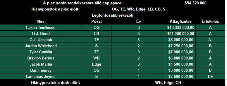 Összességében az látszik, hogy a Jetsnek mi volt a szándéka és bár voltak jó húzásaik, mégse lehet azt elmondani, hogy elájultunk volna ettől a FA-tevékenységtől. Rengeteg pénzük volt, ehhez képest egyedül Tomlinsonra tudom azt mondani, hogy a posztja krémjéből érkezett volna, a két tight end bár nem rossz, főleg ami a lehetőségeket illeti, de nem a két legveszélyesebb fegyverről van szó. Egy nagyobb nevű elkapót mindenképpen hiányolok, mert bár mennyiségre megvannak Wilson célpontjai, minőségre olyan so-so, ami eszembe jut. Ugyanezt tudom elmondani a védelemről is, Reed és Whitehead két jó játékos, korrekt áron, de az igazán nagy nevű secondary játékosok elkerülték a csapatot. Ez pedig a tavalyi botrányos teljesítmény után számomra kicsit meglepő.