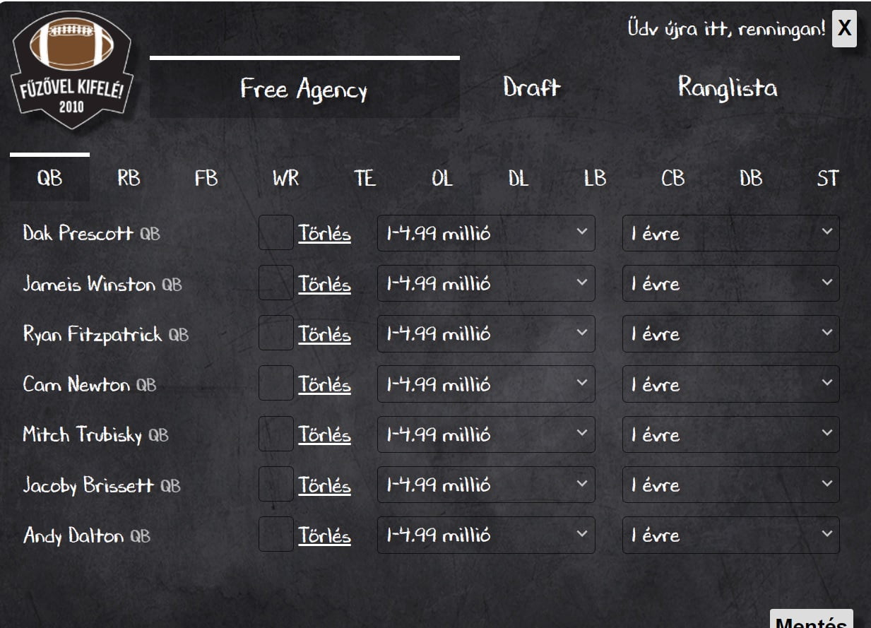 - Amennyiben egy listán szereplő játékos franchise taget kap vagy hosszabbít a határidő előtt, akkor töröljük a rendszerből (hiszen ezek még a tippek leadásának határideje előtt megszületnek). Ez nem fogja befolyásolni a többi tippet, egy esetleges törlés után nem kell újra kitölteni a játékot.