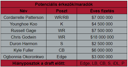 A piacról leginkább olcsó, nagyobb potenciállal bíró megoldások érkezhetnek. Ilyen például Kyle Fuller, aki csúnyán leírta magát tavaly a Broncosban, de a tehetsége alapján top corner, illetve a jó nevű Ogbonnia Okoronkwo, aki szituációs pass rusherként elég jó volt Los Angelesben és kezdőként lehet benne némi extra. És bár nem valószínű, de a kora és a posztja fontossága miatt érdemes lenne a Falconsnak rárepülni Chris Godwinra, ő két év múlva is nagy értéket fog képviselni és egy újjáépülő csapat alappillére lehet.
