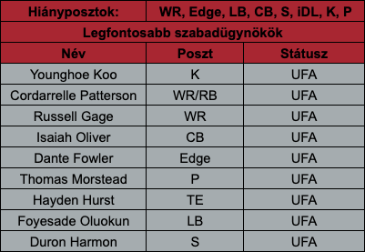 Ami a többieket illeti: Russell Gage egy harmadik számú elkapó, annak is csak átlagos. Viszont mellette szinte minden elkapónak lejár a szerződése, így az ő esetében lehet arról beszélni, hogy érdemes visszaigazolni. Az offense-ből még a korábbi első körös Hayden Hurstöt lehet kiemelni, aki sem Baltimore-ban, sem Atlantában nem tudott felnőni a magas kiválasztásához, így nagyon gyenge piaca lesz.