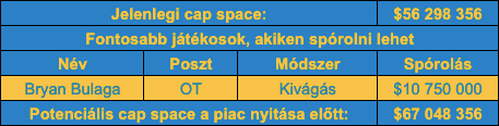 A lejáró szerződésű játékosokkal együtt elég sok a hiányposzt a csapatnál, hiszen offense szinten kellene egy elkapó, egy tight end, egy guard és egy tackle, a védőknél egy komplett belső védőfal, egy pass rusher, egy linebacker és egy cornerback is. Ezekre részben megvan megoldás visszaigazolásokkal, részben viszont külső segítséghez kell fordulni. Van tehát dolog bőven, de szerencsére pénz is.