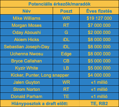 Ezen kívül jönni fog még Derwin James hosszabbítása valamikor idén, amivel akár lehetne csökkenteni az idei cap hitjét (6,4 millióval), de nem kell feltétlen így strukturálni, hiszen belefér most egy nagyobb cap hit, ha később alacsonyabb lesz. Mindenesetre ez a piacnyitásra nem lesz meg minden bizonnyal, és cap növekedés szempontból sem kell vele számolni, ez csak egy kis kitekintés. És ha már itt tartunk, akkor érdemes azt is megjegyezni, hogy jövőre szinte nincs fontos lejáró szerződésű játékosa a csapatnak, szóval a helyzet rózsás – nyilván sokat segít az újonc szerződéses szupersztár irányító a cap helyzeten.