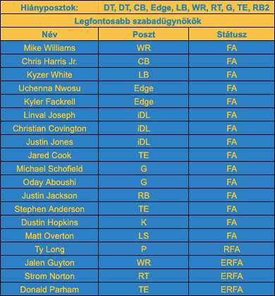 Skill playereknél maradva Jared Cook és Justin Jackson mehet isten hírével. Előbbi kis túlzással több kárt okozott, mint hasznot, több mentális hibája is volt a szezonban, amiből nagyon rosszul jött ki a csapat. Utóbbi pedig sérülékeny, így nem prioritás a megtartása, de majd egy RB2-t találni kell Ekeler mögé. A támadófalban lejár a szerződése három guardnak is: Oday Aboushi, Senio Kelemete, Michael Schofield. Közülük Aboushi a legjobb, így leginkább őt lehet érdemes megtartani, de alapvetően egyikük sem fog sokat követelni a piacon. Megemlíthetjük még Donald Parhamet, Jalen Guytont és Strom Nortont, akiket ERFA-tenderrel meg fog tartani a csapat – utóbbi esetében jó lenne, ha a jövőben nem kellene kezdenie RT poszton, hanem csere lehetne.