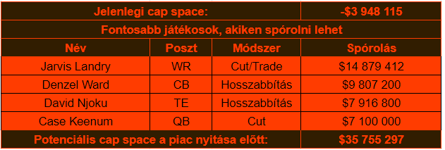 A franchise-nak ezen kívül van lehetősége több veterán szerződését módosítani extra milliókért, de már a Landry-Keenum páros menesztése is extra 21 millió dollárral jár, ami a meglévő kerettel kiegészülve önmagában elég lehet minden hiányposzt befoltozására. Sokkal célszerűbb lenne a franchise tagelt David Njokuval és a kiváló corner Denzel Warddal hosszabbítani.