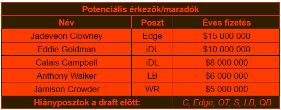 A Cleveland számára a 2022-es szezon lesz a vízválasztó. Az kiderült tavaly, hogy Baker Mayfield nem az a megváltó, akire már nagyon régóta vártak, így a hosszabbítás le is került az asztalról. A fiatal irányító ráadásul szerződése utolsó évébe lép, az ötödik éves opciójával 18,858 millió dollárt fog idén keresni és ha még szeretne kezdő pozíciót magának valahol (akár Clevelandben), akkor most kell villantania. Emellett olyan játékosok is a szerződésük utolsó évébe lépnek, mint a center JC Tretter és a right tackle Jack Conklin, így a minimum top 3-as támadófal hosszú távú szinten tartásával is foglalkozni kell lassan.