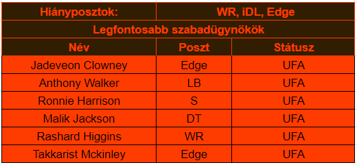 A Browns a 2020-as rájátszásba jutás után már a Super Bowlt célozta volna meg tavaly, ehhez képest csak egy kiábrándító pofon érkezett. A roster minősége már most is nagyon jó, és bőven lesz keret erősíteni, így csak az a kérdés, hogy Baker Mayfield köré lehet-e egy olyan csapatot rakni, ami képes a bajnoki címért küzdeni. Most vagy soha.