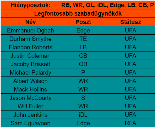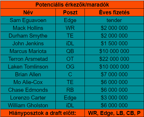 Minden jel szerint Tua Tagovailoa marad a Dolphins irányítója, hiszen az összes Deshaun Watsonnal kapcsolatos pletykát elhessegették. Ez pedig azt jelenti, hogy minden centet és draftpicket megtartva lehet erősíteni a rosteren, kihasználva a harmadik évére készülő irányító újonc szerződését. Már a vezetőedzői kinevezés is előkészítette ezt a projektet, de most a piac nyitásával kellene folytatni ezt.