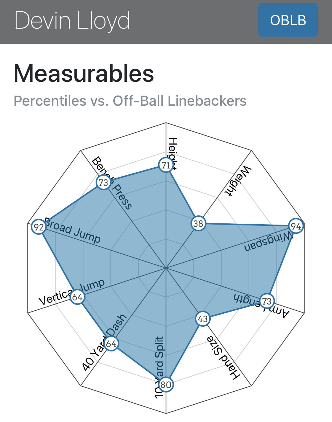 Hiányérzetünk egyedül a 40 yardos sprintje kapcsán lehet, hiszen a Combine-on 4,66-os eredményénél jobbat vártunk, de a felvételeken megmutatta, hogy játéksebessége ennél sokkal jobb, hirtelen irányváltásaival és zárkózásaival a class krémjéhez tartozik.