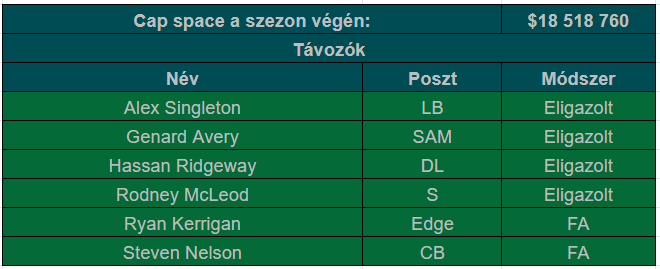 A csapatot elhagyókért tehát sok könnyet nem kell hullajtani. Singleton gyártotta a tackle-öket zsákszámra, de hibázott is elég sokat és coverage-ben is el volt veszve kicsit – persze azért az $1,1 millióért, amiért a Broncos elvitte, meg is lehetett volna tartani legalább tartalékosnak, mert arra meg jó. Avery konkrétan semmit sem tudott hozzátenni a csapat játékához, Ridgeway pedig rotációs védőfalember volt, ilyet bármikor bárhonnan szerez a gárda. Kerrigan az egyetlen Bucs elleni PO-meccsen kívül még csak szerelést sem tudott felmutatni, így érte sem kár. McLeodot szeretik az öltözőben, de egy abszolút nélkülözhető játékos, bár azért a poszt elég vékony jelenleg (nem véletlenül érdeklődnek Tyrann Mathieu iránt). Nelson egy korrekt CB2, ő kvázi a legnagyobb veszteség, de láthatóan fiatalítani akar az Eagles a poszton.