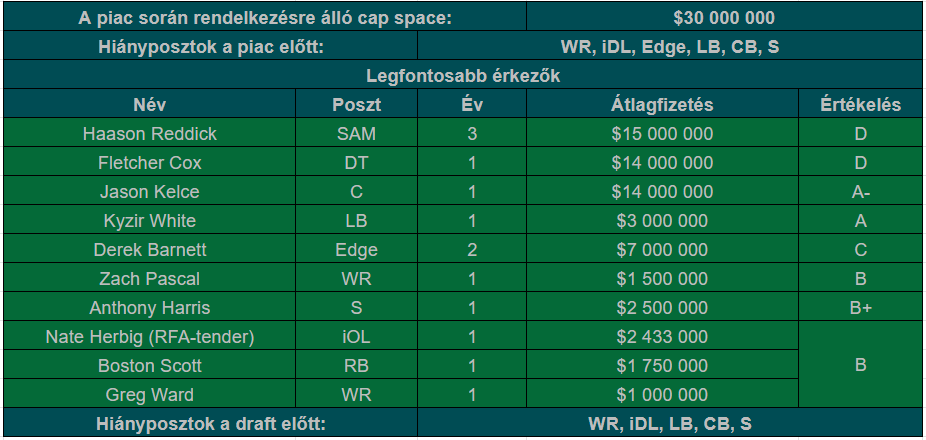 Howie Roseman general manager a cserékkel és ezáltal a draft pickek gyűjtésével elég jól garázdálkodott az utóbbi egy évben, hiszen Carson Wentz eladásával, illetve a Dolphins és a Saints lehúzásával az idei és a jövő évi draftra is két első körös picket gyűjtött be, plusz még egy második- és egy harmadik kört is betett a kasszába a következő börzékre. Kapott is egy szerződéshosszabbítást, azonban amennyire jól sikerültek ezek a cserék, annyira nem tetszik az idei piaci tevékenysége a csapatnak.