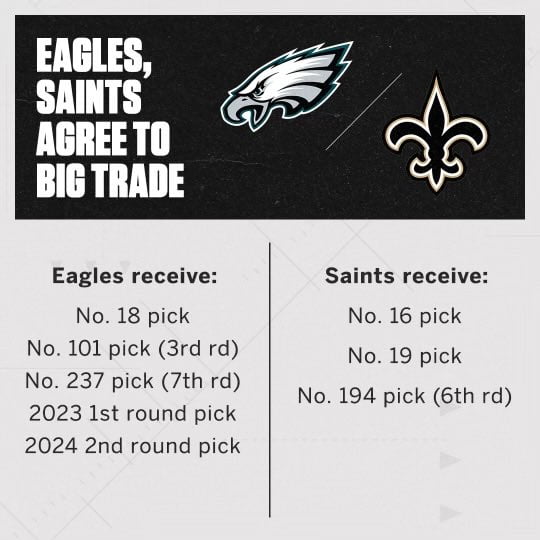 Az Eaglesnek három választási joga is volt a 15. és a 19. pick közt, ebből most egyet eladott a Saintsnek. Az várható volt, hogy a Philly nem fog a helyén maradni mindhárom pickkel és inkább bezsebelnének egy jövő évi első kört, ezt most sikerült is megtenni, így 2023-ban egy jobb QB classban több tőkéje lesz a csapatnak. A Szentek pedig a jelek szerint folytatják a mában élés stratégiáját, a jövő valamilyen szintű beáldozásával, de ezzel kétszer választhatnak az első körben idén.