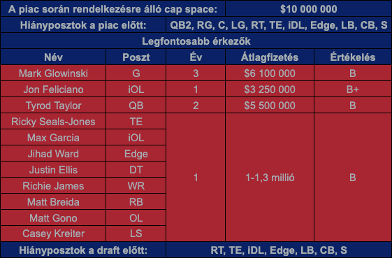 A roster nem erősödött, sőt egy kicsit még gyengült is az amúgy sem túl fényes kilátásokhoz mérten, ami nem vetít túl szép szezont magunk elé, de kontextusba kell helyezni, hogy a Giantsnek ez most egyértelműen egy átmeneti év és majd 2023-ra lehet készülni, ahol egyébként a harmadik legtöbb elkölthető pénze lesz a csapatnak jelen állás szerint. Szóval majd akkor kezdi el úgy igazából a munkát az új vezetőség, addig konkrétan semmi rosszat nem lehet rájuk szólni, ha nem jönnek az eredmények – és ez azért sajnos várhatóan így is lesz –, az egyértelműen az előző rezsim hibája lesz. Ez a projekt valójában majd egy év múlva kezdődik el. Addig is marad a reménykedés, hogy Brian Daboll kezei alatt a támadósor előrelépést mutat, ami azért nem lenne meglepő, és üdvözítő is lenne a jövőre nézve.