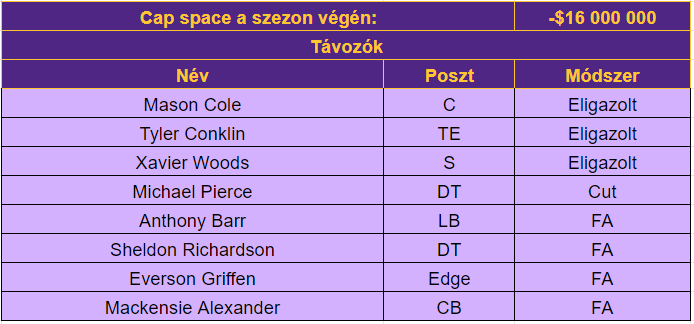 Michael Pierce nagyon mellément. A remek belső védőfalember 2020-ban három évre 27 millió dollárért igazolt Minnesotába, de az első évét kihagyta a Covid miatt, tavaly pedig sikerülés miatt csak hat meccsen lépett pályára. Az elküldésével 6 millió dollárt lehetett spórolni, így a 16 millió dolláros cap túllépés mellett nem volt kérdés, hogy nem lesz maradása. Rajta kívül senkit nem rúgott ki a csapat, a szokásos rezsimváltás utáni nagytakarítás abban merült ki, hogy a lejáró szerződésű játékosok nagy része mehetett, amerre látott.