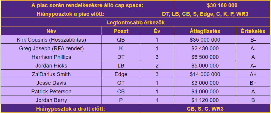 Feltehetően nem véletlen, hogy Kirk Cousins is csak egyéves hosszabbítást kapott, jelenleg vele is csak a következő két szezonban számol a csapat. Természetesen a fizetése teljesen garantált, ami persze érthető és pénzt is sikerült ezzel felszabadítani, csak nehéz megmagyarázni, miért ragaszkodik hozzá annyira a Vikings, mikor az elmúlt négy évben mindössze egyszer ért el pozitív mérleget úgy, hogy egy minimum top 10-es roster volt körülötte.