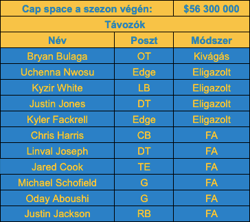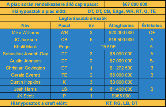 Nwosunak én bírom a játékát, de jelentősen sikerült upgrade-elni a poszton, így nyugodtan el lehetett engedni, ahogy Kyler Fackrellt is. A védőfal belseje pocsék volt tavaly, így nem meglepő, hogy nem kapkodtak Justin Jones és Linval Joseph visszaigazolásáért sem. Egy sorral hátrébb Kyzir White-ot lehet érdemes lett volna megtartani, főleg látva, hogy csak $3 milliót kapott a piacon, illetve hogy nem érkezett erősítés a helyére. A védelemnél maradva Chris Harris is távozhatott, megkopott már a játéka és CB poszton is érkezett egy sztárjátékos a piacról. A támadóknál Jared Cook majdhogynem több kárt okozott, mint hasznot, és sikerült kicsit jobb kaliberű és fiatalabb játékossal pótolni. A két guard közül Aboushit talán megérné még visszaigazolni, mert az RG poszt elég lyukas – nem egy sztár ő sem, de jelenleg kezdő lehetne.