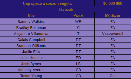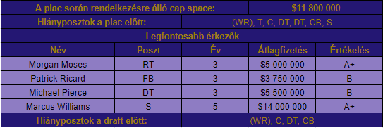 A Ravens lehetőségei korlátozottak voltak a csapat megerősítését illetően. Több megfizetett sztár mellett Lamar Jackson 5. éves opciója is közrejátszott abban, hogy nem lubickoltak a cap space-ben. Nem is volt a csapatnak túl sok hiányposztja, de mind a három kívülről érkező igazolásuk remekül sült el. Ha Za’Darius Smith sem gondolta volna meg magát, valószínűleg a legtöbb offseason értékelő lista első helyén találtuk volna a marylandi csapatot. Keseregni persze így sem kell, kevés needdel fordulhatnak rá a draftra. A corner és a védőfal további mélyítése mellett egy kezdő centerre vannak a közel kész állapottól. Persze mélység vagy extraklasszis játékos az elkapó vagy a linebacker szobába is érkezhetne még, de kevésbé van beszorítva egy-egy kulcsterület irányába a csapat, mint a legtöbb franchise a ligában.