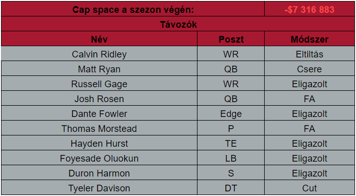A csapat 7 millió dollárral lépte túl a fizetési sapkát, amiből akár 37 millió dollárt is lehetett volna csinálni. Ugyanakkor ennek előzetesen csak akkor lett volna értelme, ha idén win now-ra mennek Arthur Smith-ék, aminek nem volt realitása. Aztán bekerült Deshaun Watson a képbe és majdnem a Falcons lett szakmailag az idei holtszezon egyik legnagyobb nyertese. Az irányító viszont inkább a Browns mellett döntött, ráadásul ez Matt Ryant sem érintette különösebben jól, így az előzetes várakozásokhoz képest teljesen más irányba kellett mennie a gárdának.