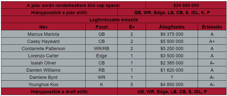 Russell Gage visszaigazolása nem lepett volna meg, viszont évi 10 millió dollárt kapott a Bucstól, ami nevetségesen sok, így nem kár érte. Hasonló a helyzet a linebacker Foyesade Oluokonnal, aki nemcsak fiatal, de abszolút kezdő potenciállal bír, viszont évi 15 millió dollárért mehetett isten hírével a Jaguarsba. Duron Harmonért kár, mert nem keres sokat Las Vegasban, az évi 1,27 millió dollárra akár rá is lehetett volna licitálni, de persze nem dől össze a világ.