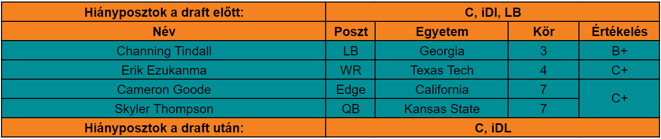 Tindall felől vannak kétségeim, hogy mennyire fog ő működni az NFL-ben, de értékben a harmadik végén abszolút rendben volt ez a pick. A két hetedik köröstől sokat nyilván nem lehet várni, értékelni is nehéz, de azért azt furcsállom, hogy minek kellett egy irányítót húzni. Ezzel párhuzamban pedig Ezukanma kiválasztása sem tetszett különösen, mert amit tud, azt a rosteren lévő Preston Williams jobban tudja egészségesen (talán Ezukanma használható futásoknál is, ennyi előnye van), és ha már nagyon muszáj lett volna, akkor is voltak bent WR-ek, akik jobban tetszettek.