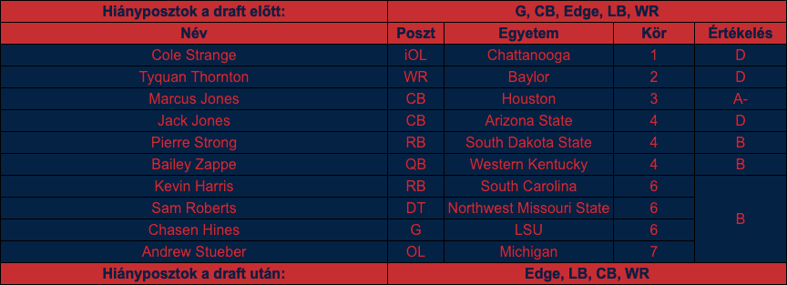 A Patriots először is lecserélt az első körön belül, majd kiválasztotta a gimiben még linebacker és defensive end, majd az egyetemen már támadófalember Cole Strange-et, aki így a valaha volt legmagasabban kiválasztott Chattanooga játékos lett megelőzve Terrell Owenst – ha olyan karrierje lesz, mint a Hall of Famernek, akkor elég jó kis pick volt ez.
