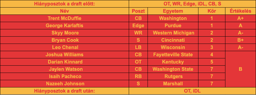 Összességében a Chiefs draftja elsőre brutálisan jónak tűnik, az első öt választásukból négy nagy stealnek mondható és hiányposztra is érkeztek. McDuffie megszerzése a draft egyik legjobb rendszerfit választásának tűnik, de Karlaftis is nagy potenciállal bír. Cook hamar kaphat szerepet a védelemben, Chenal pedig túl jó értéket képviselt a harmadik kör végén, hogy kihagyják. A harmadik napon aztán kicsit behúzta a kéziféket a gárda, Kinnardon kívül nem annyira látom, hogy ki milyen céllal érkezett pontosan, de itt már nehéz rábökni a játékosokra.