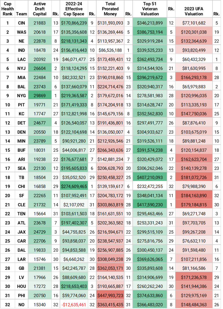 Alapvetően öt tényezőt vizsgáltak, ezek összessége alapján állították fel a sorrendjüket. Figyelembe vették az újonc szerződéses játékosok értékét, ezzel egy aktív drafttőke kategóriát kreálva. Kiszámolták, hogy mennyi a csapatok “effektív fizetési plafonja” idén és a következő két évben. Nézték, hogy mennyi garantált összeget fizettek ki előre a csapatok, amit majd később könyvelnek el. Figyelembe vették a jelenlegi keret erősségét, illetve pontosabban értékét. Ezen kívül megnézték azt is, hogy jövőre hány és milyen értékű szabadügynöke lesz a csapatoknak.