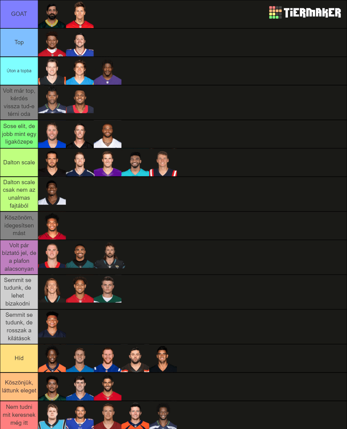 Kicsit hasonló a helyzet Wilsonnal is, már nem látom benne azt, hogy ő Super Bowlba tudna vezetni egy csapatot, de talán a környezetváltás kihozza belőle újra az elitet. Tannehill még furcsa lehet ezen a polcon, igazából őt még nem tudom megfejteni, mert tud ő nagyon jól és borzalmasan is játszani, szóval ő egyelőre egy megfejthetetlen talány, de arra azért alkalmas, hogy playoffba vigye a csapatot.