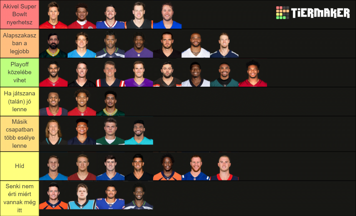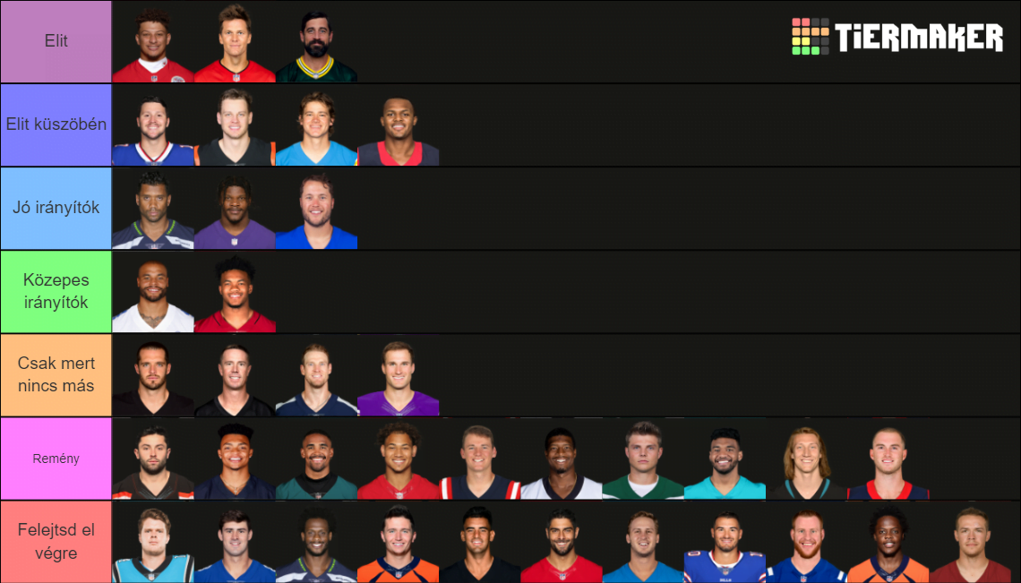 Kiváló témát adtak, jár érte a kalapemelés. Nálam az elit 5-6 játékosból áll, függetlenül attól, hogy mennyi játékidő van mögöttük, elit szinten játszol, (nálam) ezt jelenti elitnek lenni. Érdekesség, hogy Patriknál ezek szerint 3 év konstans teljesítmény kell ahhoz, hogy valaki csatlakozhasson az elit klubhoz és a nagy trióhoz. Az szinte pofán vágott, hogy Prescottot egyenesen a „SB-t nem nyersz vele” kategóriába sorolta. Azt gondoltam a szerkesztőség en bloc magasabban van Prescottal. Volt már elemző cikk a játékáról, amiből kiderült, hogy bizony rendszeren kívül extra dolgokat csinál, de gondolom a konzisztenciát hiányoljátok. Viszont emellett volt furcsa látni, hogy Winstonnal kapcsolatban mennyire él még a bizalom többekben is, amelyet én nem feltétlen érzek indokoltnak. Carr-Cousins-Tannehill-Ryan nagyjából a középső polc mindenkinél más-más megnevezéssel, bár Jarrednél Tannehill 2. kategóriába sorolása azért eléggé rockandroll. Balázsnál azt éreztem nem igazán értette meg a feladatot. Ez így ebben a formában tipikusan az az eset, amit az iskolában a tanár ránézésre áthúz és ad rá egy egyest. Nem részletes, egyéni jellemábrázolásokat kellett adni, majd teljesen elvont dolgokkal felcímkézni őket, a sok rizsát le lehet írni más, ezer alkalommal elemző cikkek, meccsbeszámolók során, most mindössze be kellett volna sorolni őket abba a néhány egyszerűsített kategóriába az eddigi tudásod alapján. Látszólag ezt nem akartad vagy merted megtenni, megúszni akartad a feladatot nem megoldani, holott ezért vagy szaki, bele kell állni a véleményedbe, akkor is ha nem egyszerű – úgy ahogy azt chester tette, hogy Lawrencet betette a franchise QB-k közé, ezt így kell csinálni. Majd legközelebb.