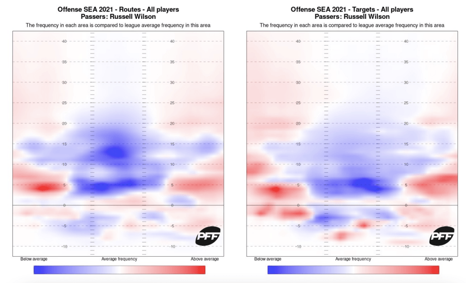 A magasság hiánya miatt Russell Wilson nem lát ki a fal mögül és nem látja a pálya közepét, ezért arra a részre nem dobál. Jól mutatja ezt a PFF által készített hőtérkép is, ahol a kék szín azt mutatja, hogy hová dobál átlag alatti gyakorisággal egy irányító (a piros pedig, ahová átlag feletti gyakorisággal). Látható, hogy a pálya közepe gyakorlatilag teljesen kihasználatlan Wilsonnal, tavaly csak az Eagles dobált kevesebbet középre a Seahawksnál (és a Hawks számait felhúzza Geno Smith).
