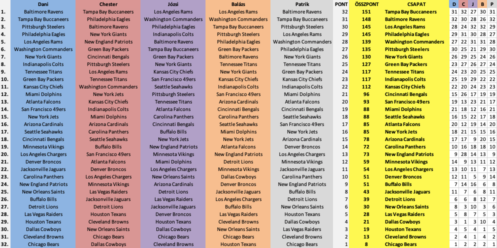 Az összesített táblázat szerint a Panthersnek 72 pontja van a 19. helyen, a Patsnak 73 a 20-on.