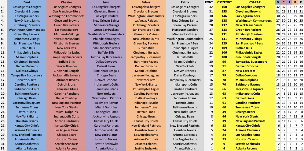 Öten vállalkoztunk erre a nemes feladatra (Balázs, Chester, Dani, Józsi és Patrik), a rangsorolási szempont pedig az volt, hogy melyik csapatnak jobbak az edge rusherei jelenleg, csak erre a szezonra vonatkozólag.