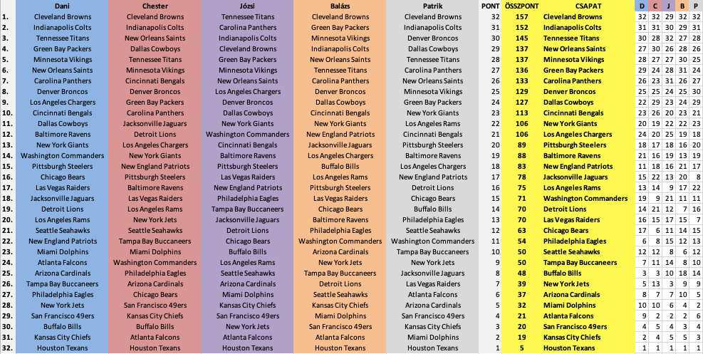 Öten vállalkoztunk erre a nemes feladatra (Balázs, Chester, Dani, Józsi és Patrik), a rangsorolási szempont pedig az volt, hogy melyik csapatnak jobbak az futó egységek jelenleg, csak erre a szezonra vonatkozólag.