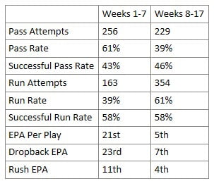 Ráadásul nem kicsi változás volt, hanem teljes 180 fokos fordulatot vettek. A Buccaneers elleni 6. fordulós meccsen 89%-ban passzoltak neutrális helyzetben, a 8. fordulós Lions elleni találkozón pedig 73%-ban futottak. A 8. fordulótól a szezon végéig 61%-os futási arányt mutattak fel minden játékhelyzetet tekintve, ami hihetetlenül magas szám – a második legmagasabb a négy irányítót is játszató Saints volt 49 százalékkal.