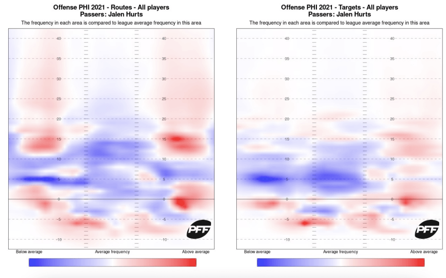 Russell Wilsonhoz hasonlóan a pálya közepét nem használja, ahogy az a PFF alábbi hőtérképéből is látható. Wilsonnál ilyen sok év után már nem igazán várható, hogy ez változik, azonban Hurtsnél még lehet erre lehetőség, lehet benne reménykedni – ahogy arra nemsokára rátérünk, ha idén nem fejlődik ebben AJ Brown érkezése után, akkor már nem is fog. Érdekes az is, hogy erősen favorizálta a pálya jobb oldalát a ballal szemben (bár ez részben a támadósor kialakításából is fakad).