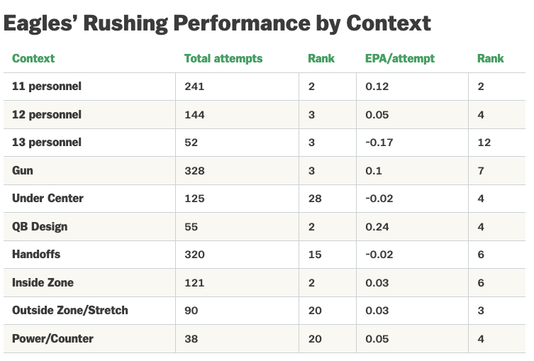 Ráadásul a hatékonyság is parádés volt, ahogy az alábbi táblázatból is látszik. EPA/play mutatóban a 21. helyről az 5.-re lépett elő az Eagles, és a futások mellett a passzok hatékonysága is feljavult a védelmek átállása miatt. Persze a defense-ek akkor sem tudták megállítani a futást, amikor akarták, az Eagles pedig az 1985-ös Bears óta az első csapat lett, amely hét egymást követő meccsen is 175+ futott yardot ért el.